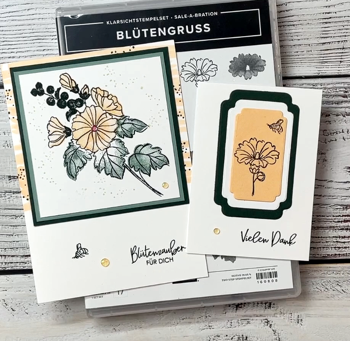 Und hier kommt die nächste Sale a Bration Prämie, die mir besonders gut gefällt: der Blütengruß. Schöne Schrift, schöner Blumenstempel... Genau mein Ding...