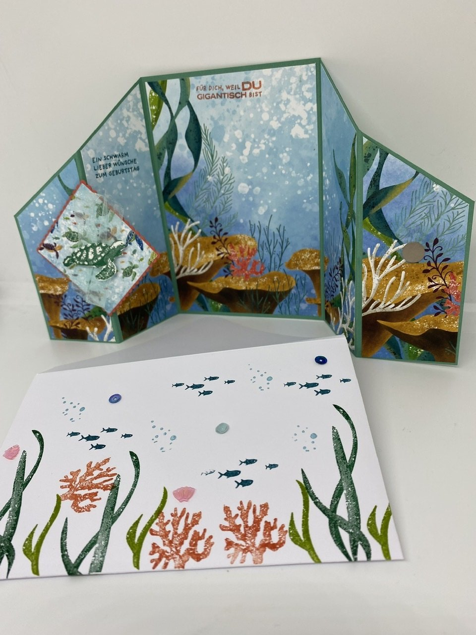 Außerdem habe ich das wunderschöne aquamarinfarbene Band aus der Serie und die Meereswelt-Pailletten verwendet, für die Vorführkarte auch die Prägeform Meeresgrund.