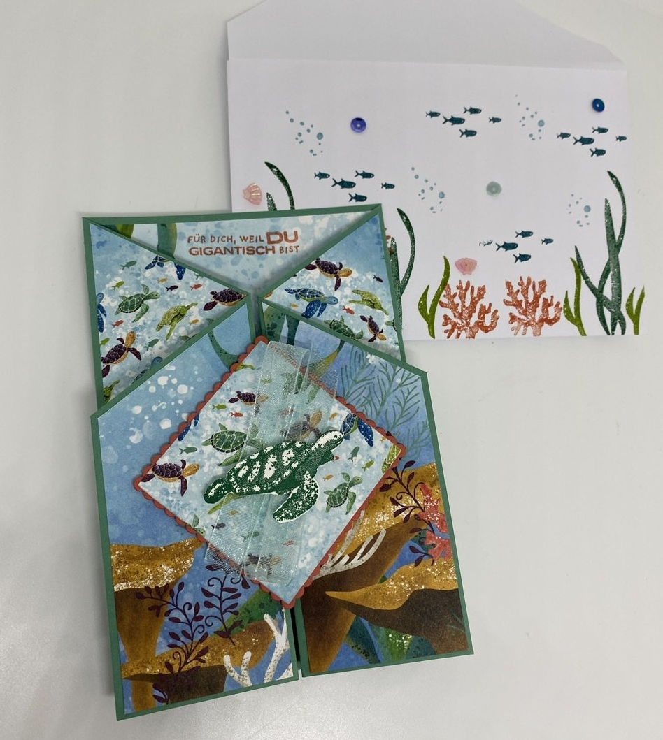 Ich habe es ja sonst eher mit zarten Farben, aber die Farbexplosion des "Meeres-Designerpapiers" haut mich schier um. Ich liebe es und freue mich mit jedem Projekt, wie authentisch die Meereswelt ist.