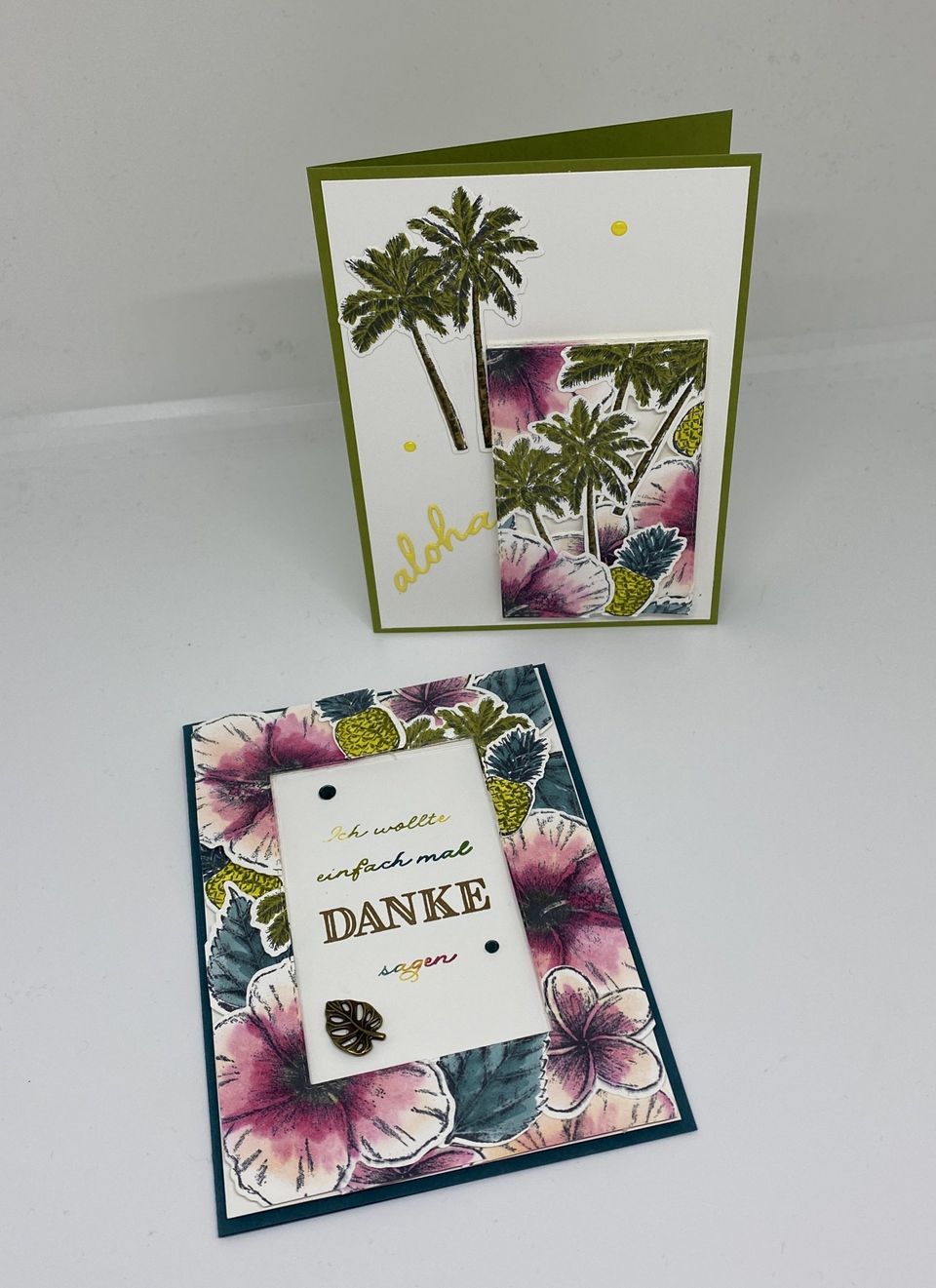 Ich habe hier das Stempelset Einfach Tropisch verwendet, um Blumen, Ananas, Blätter und Palmen zu stempeln und anschließend mit Stampin´ Blends in Ananas, Pfauengrün, Olivgrün, Kussrot, Blütenrosa und dem Farbaufheller zu colorieren. Danach habe ich sie mit den passenden Stanzformen einzeln ausgestanzt und auf ein Stück Farbkarton im Maß 10 cm x 14 cm gelegt. Darauf habe ich dann die Klarsichtfolie befestigt und einen Rahmen mit den bestickten Rechtecken gestanzt. Somit habe ich einen Rahmen für die eine Karte und das Stanzteil für die andere Karte.