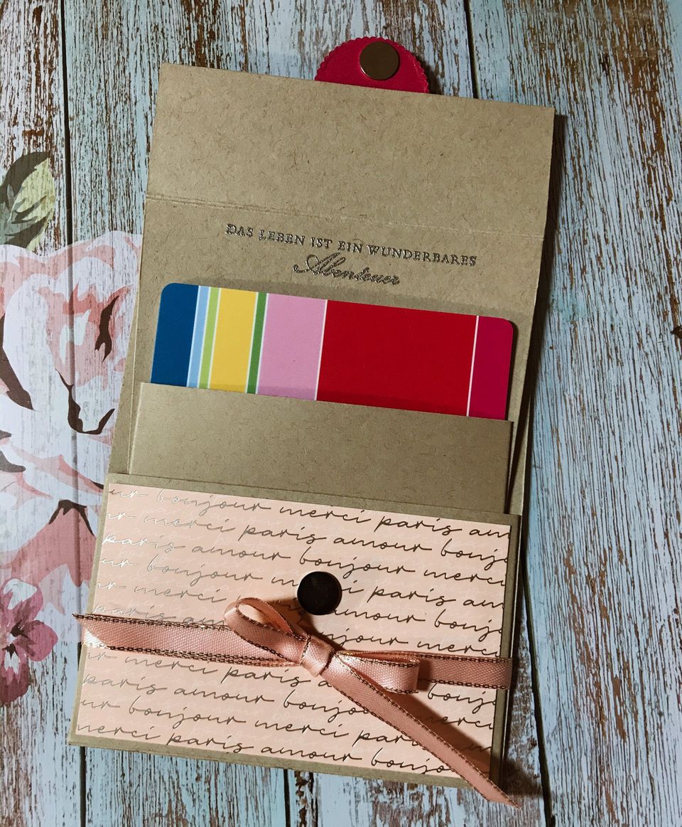 Heute habe ich diese hübsche Gutscheinkarte mit Hebemechanismus für Euch. Die Idee dazu kam mir, als ich neulich eine Ähnliche geschenkt bekommen habe von Amazon. Allerdings sah das Design zum Weglaufen aus, also habe ich die Maße etwas angepasst und mit meinem Design verändert. Der Clou ist, dass ein kleines Einsteckfach rausfährt, wenn man die Karte öffnet. Dabei ist es einem selber überlassen, ob man eine Gutscheinkarte oder einen Geldschein hineinsteckt. Ich finde, dass der Spruch auch einlädt, jmd. etwas zur Urlaubskasse dazuzutun.