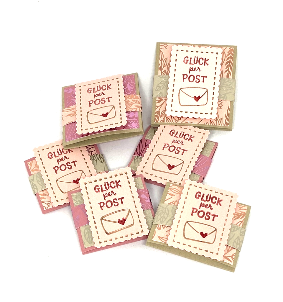 Die Verpackung dazu ist ganz einfach, ein Streifen Farbkarton (ich habe die Farben Savanne, Blütenrosa und Rokokorosa verwendet) im Maß 5 cm x 11 cm, gefalzt bei 5 cm und 10 cm. Für die Manschette habe ich einfach einen 1,5 cm Streifen Designerpapier um die Verpackung gelegt, als der Magnet schon mit einem Miniklebepunkt befestigt war, und zwar ohne vorher zu falzen. Mit einem kleinen Stück doppelseitigem Klebeband habe ich die Manschette zusammengeklebt und mit dem wunderbaren Stempelset "Schneckenpost" einen mehrfarbigen Stempelabdruck auf ein Stück Blütenrosa Farbkarton gestempelt. Das Mehrfarbige habe ich durch das Anmalen des Motives mit Stampin´ Write Markern in den Farben Savanne, Rokokorosa und dem Herzen in Glutrot gemacht. Mit der Briefmarken-Handstanze habe ich den Stempelabdruck ausgestanzt.