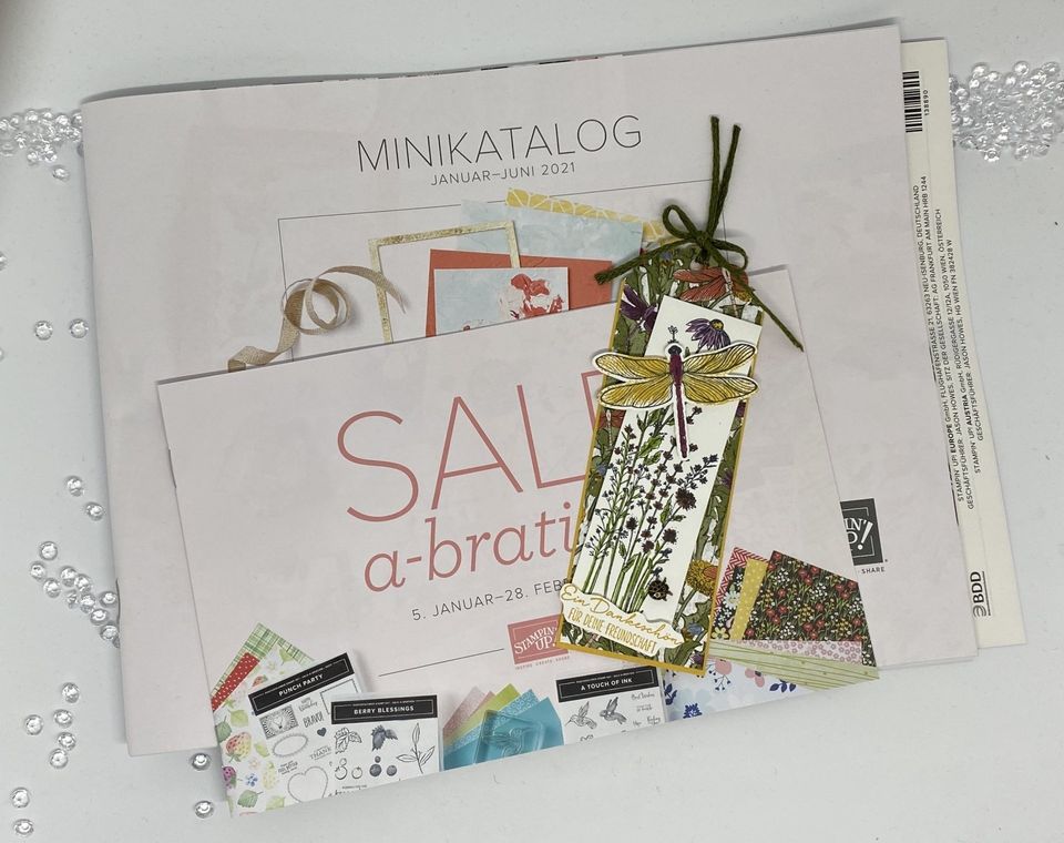 Ich möchte Euch zunächst mal zeigen, was meine Katalogbestellerinnen im letzten Jahr noch als kleine Zugabe zum Katalog bekommen haben. (Fast) immer lege ich Lesezeichen bei, weil man sich so die Lieblingsseite markieren und dennoch die neuen Materialien live sehen kann.