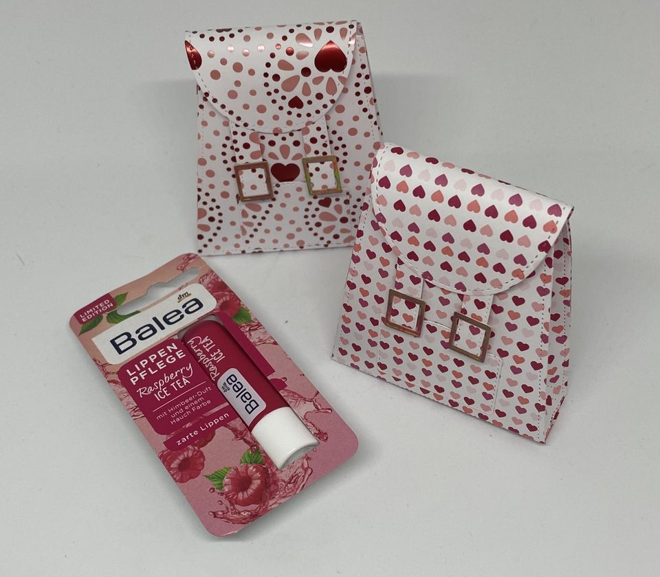 Also habe ich die Stanzformen aus dem Produktpaket So Stilvoll ausgewählt und einen kleinen Ranzen draus gemacht. Für die Mädels kommen ein Prinzessinen - Labello und ein paar Spängchen hinein, für den Jungen ein kleiner Dinosaurier Radiergummi und ein paar Gummibärchen. Von dem Ranzen für den Jungen habe ich leider kein Bild mehr, weil ich es irgendwie vergessen habe, ein Bild zu machen. Aber den könnt Ihr Euch ja im Video ansehen.
