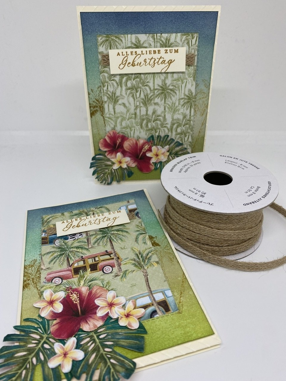 Die hübschen Blumen und die großen Blätter habe ich mit der Schere aus dem Designerpapier geschnitten und vorne aufgeklebt. Ein Stückchen Leinenband noch mit vorne drauf und einen Spruch mit hellbrauner Stazon Tinte auf einen Rest flüsterweißen Farbkarton. Der Spruch ist aus dem Stempelset Tropische Träume.