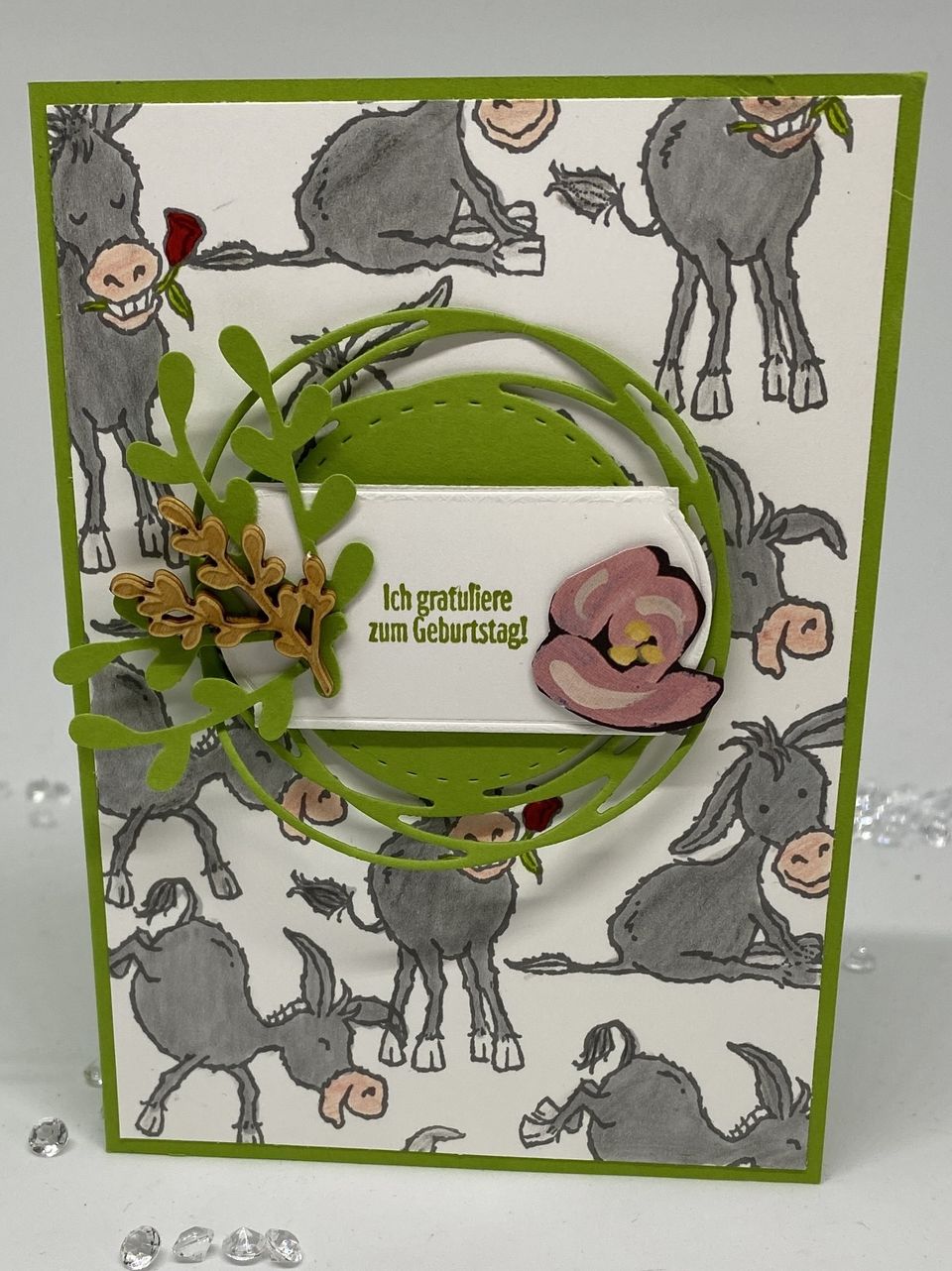 Nun aber zurück zur Karte. Ich habe einfach mehrere Eselchen aufgestempelt und coloriert mit Stampin´ Blends. Das Schöne an den Blends ist, dass man in Natura die Malstriche nicht sehen kann. Also nicht so wie bei den Kinder Filzstiften. Die Belichtung des Fotos zeigt allerdings die Stiftstriche, in Natura ist das anders.
