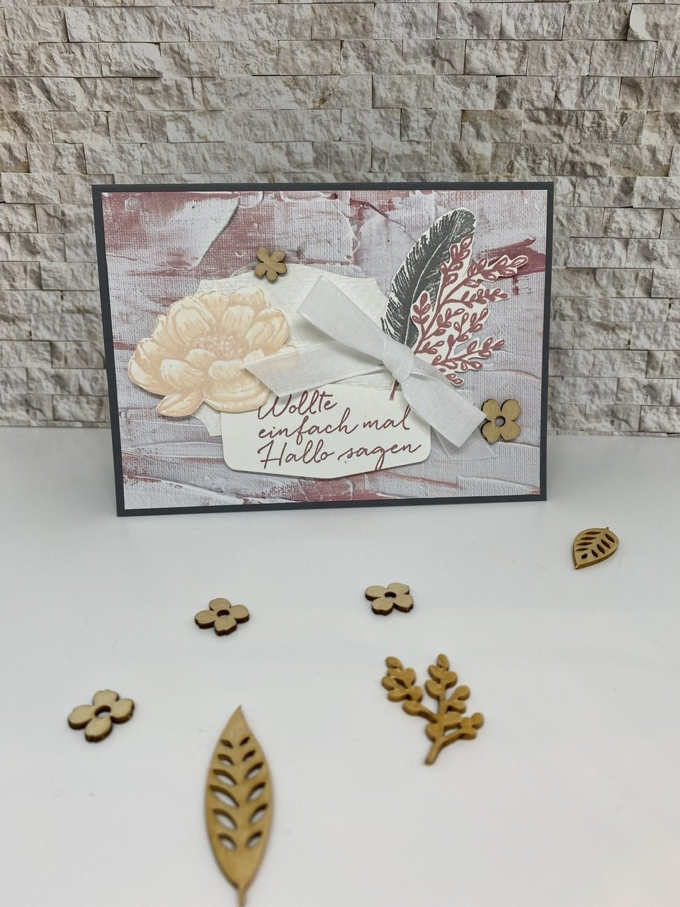 Die erste Karte ist eine ganz einfache, man benötigt kaum Material. Ich habe die Hintergrundstempel des o. g. Stempelsets in Anthrazit und Blütenrosa aufgestempelt im zweiten Abdruck und einen Spruch mit dem ersten Abdruck. Die Grundkarte in Anthrazit hat das Maß 21 m x 14,5 cm und der Aufleger in Vanille 10 cm x 14 cm. Die Blümchen - Holzaccessoires hatte ich noch aus früheren Beständen, aber in der Produktreihe Geschmackvoll gestaltet gibt es ja auch ganz wunderschöne Holzaccessoires.
