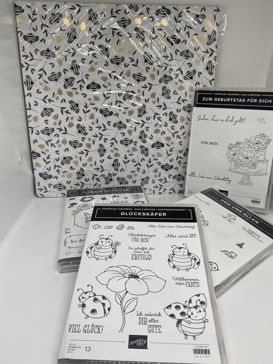 Ich habe für Euch die Stempelsets "Florale Etiketten" (passend zu den Handstanzen Apartes und Entzückendes Etikett), "Von uns Allen" und "Zum Geburtstag für dich", außerdem das Designerpapier Bienengold. Manches habe ich auch noch doppelt. Diese könnt Ihr gewinnen bei der nächsten Sammelbestellung am 21.04.2020. Unter allen eingehenden Bestellungen verlose ich jeweils eines dieser Prämien. Gerne könnt Ihr bei Eurer Bestellung angeben, welche Prämie Euch am liebsten wäre.
