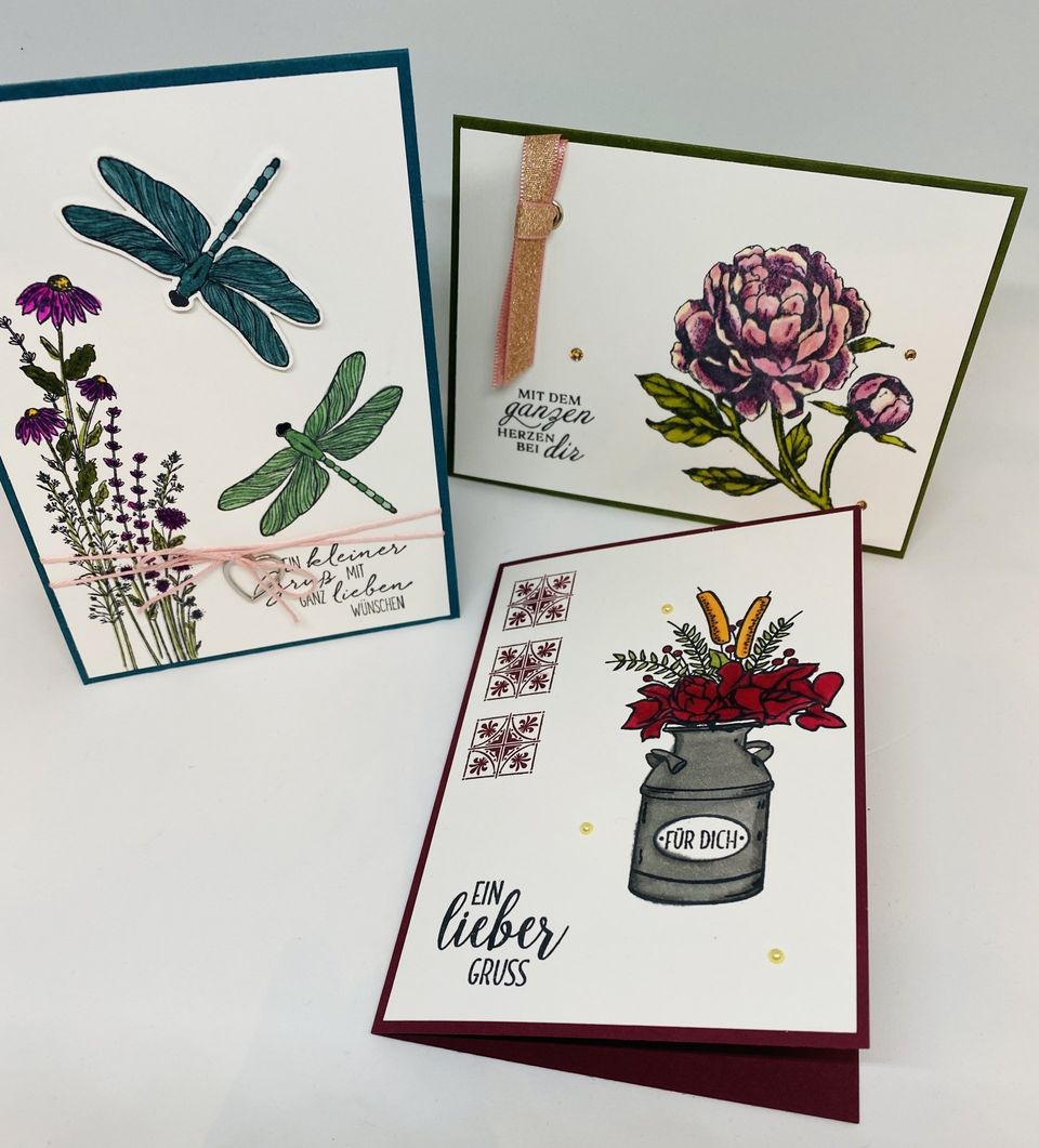 Es sind dennoch wunderschöne Projekte geworden. Auf dem oberen Bild seht Ihr also meine Prototypen und das Materialpaket, bestehend aus 3 vorgestempelten Motiven. Ich habe mich für die Stempelsets "Landleben", "Pfingstrosenpoesie" und den "Libellengarten" entschieden. Und hier seht Ihr die Projekte der Teilnehmerinnen. I love these.