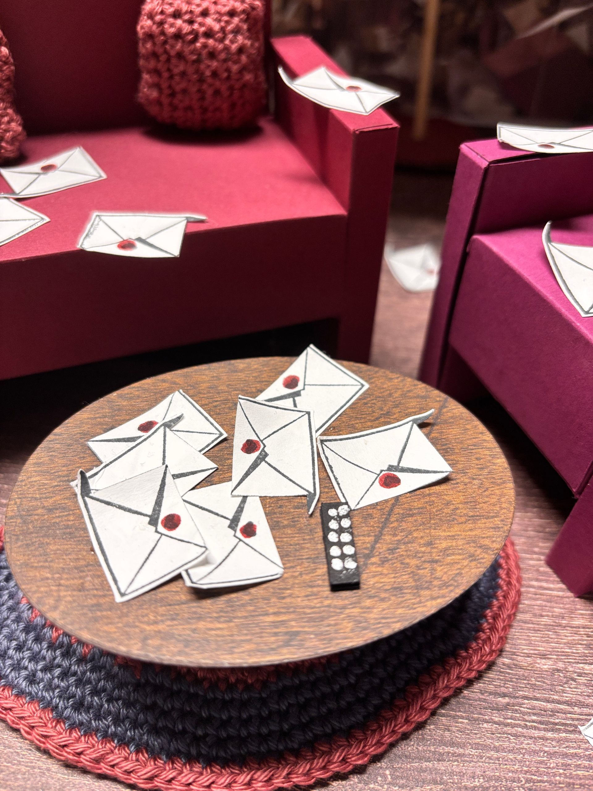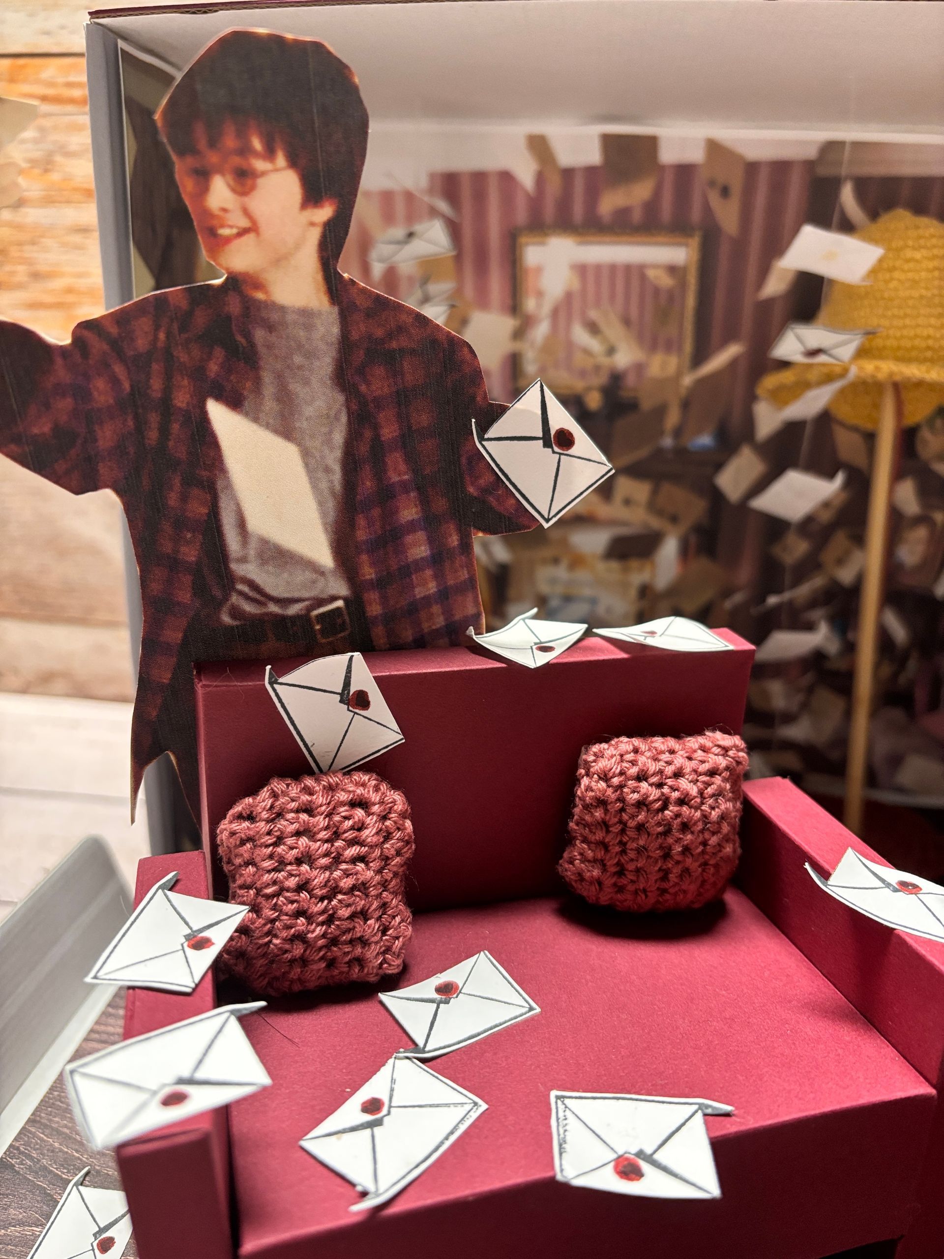 Wir haben die Innenseite des Kartons mit der Szene in Dursleys Wohnzimmer aus dem Internet farbig ausgedruckt. Sofa, Sessel und das Gestell für den Wohnzimmertisch habe ich berechnet und Lara hat alles zugeschnitten, gefalzt und anschließend zusammengeklebt. Die Tischplatte hat sie mit einer ovalen Stanzform ausgestanzt, ebenso wie die Fenster und die Tür, die die Außenseite bildet. Die Briefe hat sie einzeln aufgestempelt, das Briefsiegel rot angemalt und der Plotter hat die Umschläge ausgeschnitten. Lara hat die einzelnen Umschläge dann auf Anglergarn gezogen. In der Schriftrolle, die ihr aussen am Karton seht, ist die Leseprobe geschrieben - Lara wollte sie nicht in den Karton kleben. Meine Freundin war so lieb und hat Kissen, Teppich und Stehlampe gehäkelt, das hätte keiner von uns hinbekommen.