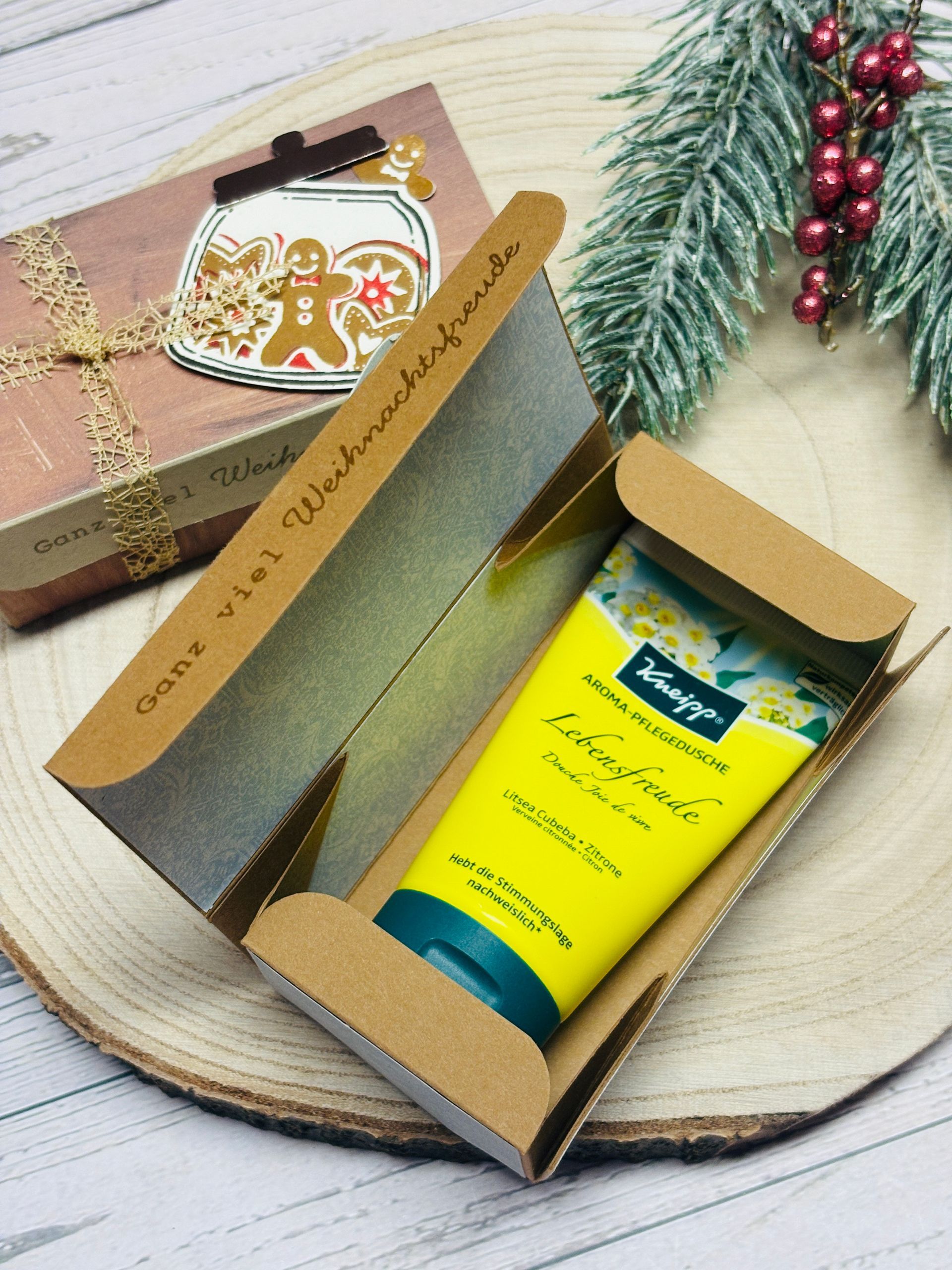 So ist diese Schachtel hier entstanden - sie könnte z. B. eine solche Pflegedusche beinhalten, auch eine nette Wichtelidee.