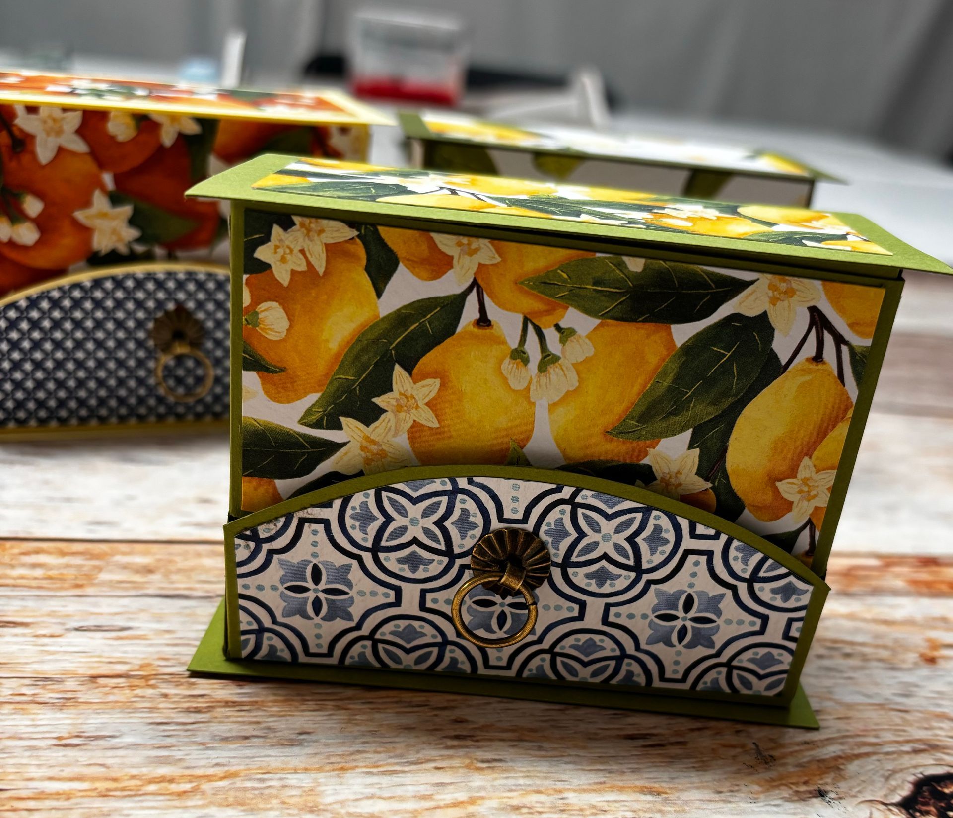 Aber ich habe das Projekt vor dem Basteltreff wirklich immer wieder in den Händen gehalten und für mich gedacht - wie schön ist das bitte... Ich habe extra aus dem Internet Zitronenbonbons bestellt, die man nicht an jeder Ecke bekommt, um das Vorhaben, meinen Bastlerinnen was schönes zu bieten, nochmal abzurunden.