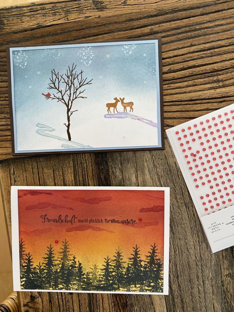 Bei der blauen Karte haben wir den Hintergrund in den Farben Rauchblau und Abendblau verwendet, den Baum in Espresso, die Rehe in Zimbraun, den Vogel in Glutrot, die Schneeflocken in Flüsterweiß, die Wege in Rauchblau (der rechte Weg sieht nur so lila aus, weil ich versehntlich den Stempel vorher nicht sauber gemacht hatte). Die Maße sind wie immer: