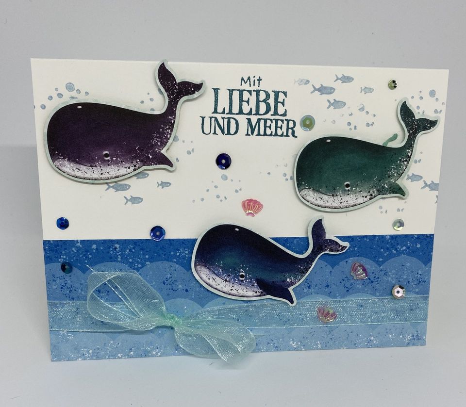 Ich habe dieses Mal keine zusätzliche Mattung verwendet, sondern nur eine Grundkarte in extrastarkem flüsterweißen Farbkarton. Darauf habe ich ein Stück Designerpapier Meereswelt geklebt und ein paar Wale mit der passenden Handstanze aus DSP ausgestanzt. Die Stempelfarben sind Rauchblau und Pfauengrün, außerdem darf natürlich das wunderschöne Geschenkband in Aquamarin und die Meerespailletten nicht fehlen. Das Stempelset heißt Fantastfisch.