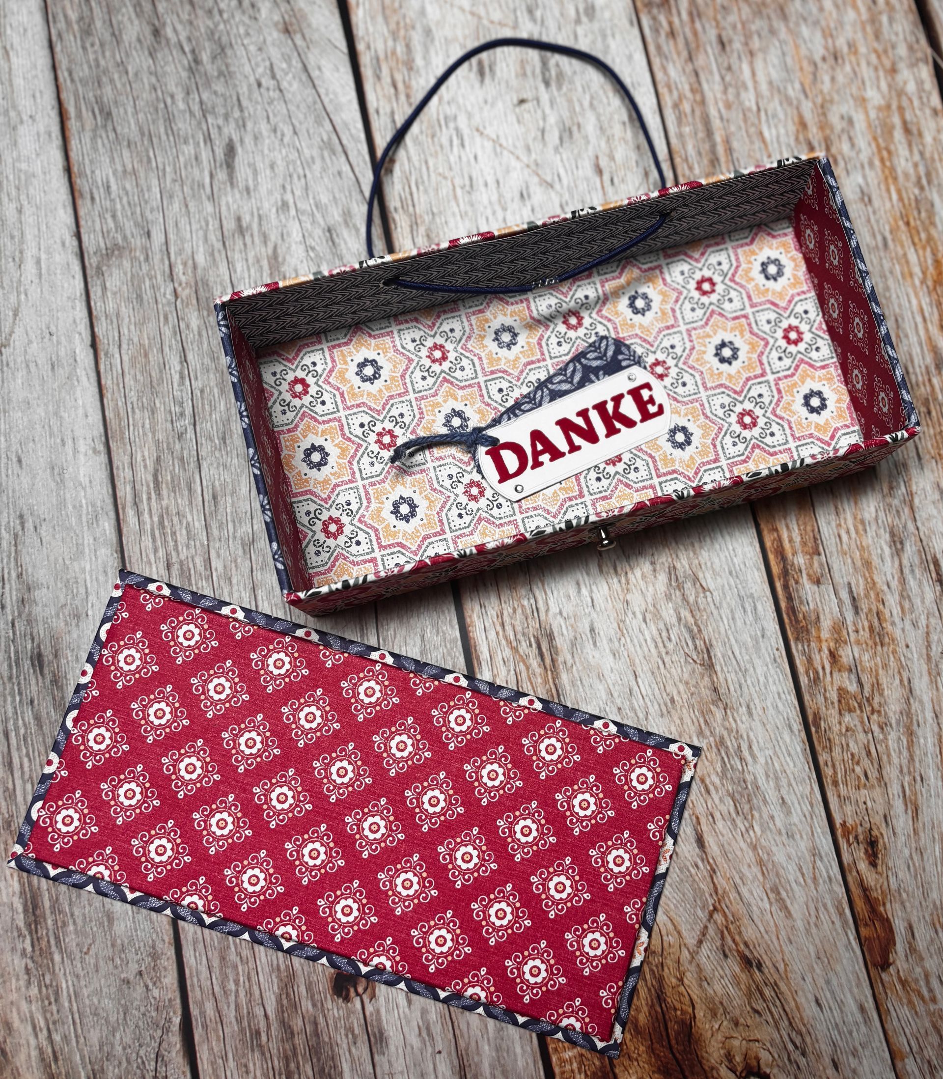 Meine Tochter hat vor den Sommerferien die geliebte Grundschule verlassen und natürlich haben wir als Klasse mit allen Eltern für die wunderbare Lehrerin ein ganz persönliches kreatives und liebevoll zusammengestelltes Geschenk gehabt. Dennoch hatte ich viele Gründe, dieser Lehrerin noch ein persönliches Dankeschön im Namen unserer Familie zu überreichen. Da ich bereits in vielen Gesprächen mit ihr meine Gründe für meine große Dankbarkeit erklärt hatte, habe ich lediglich ein gestempeltes Dankeschön mit in diese Stiftebox gelegt. Das eigentliche Geschenk war ja ohnehin die Stiftebox. Diese habe ich aus Graupappe mit 2 mm Stärke gebastelt und anschließend mit Designerpapier aus meinem Altbestand bezogen. Die Farbkombination aus Rot und Blau mag ich ja selber total gerne und ich denke, sie ist auch gut angekommen.