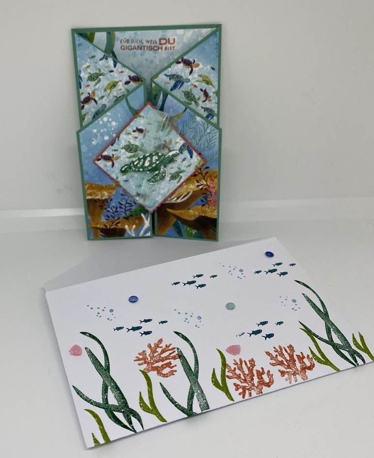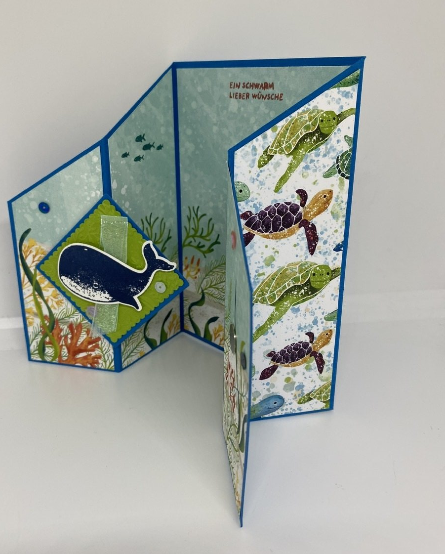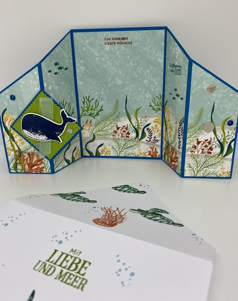 Ich habe es ja sonst eher mit zarten Farben, aber die Farbexplosion des "Meeres-Designerpapiers" haut mich schier um. Ich liebe es und freue mich mit jedem Projekt, wie authentisch die Meereswelt ist.