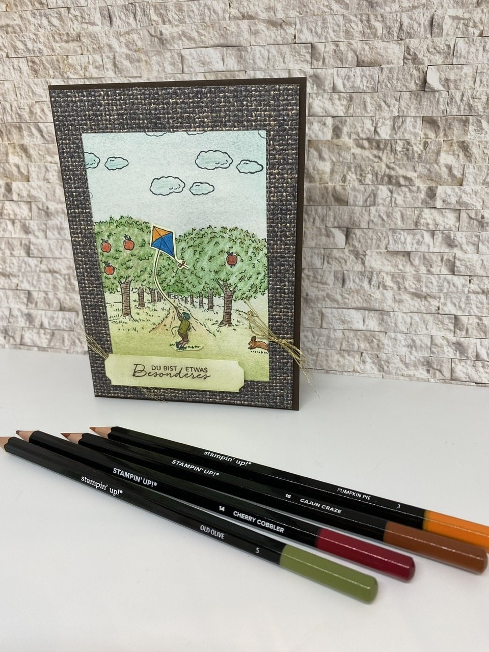 Gestempelt habe ich das Motiv mit schwarzer Memento-Tinte und coloriert in den Farben Glutrot, Olivgrün, Bermudablau, Marineblau, Kürbisgelb, Apfelgrün, Wildleder und Espresso. Der Spruch stammt aus dem Stempelset Geschmackvoll gestaltet und gestanzt mit der Handstanze nach Wahl Allerliebste Anhänger. Ein bisschen Goldkordel aus dem Kombiband Ewiges Grün darf auch nicht fehlen.