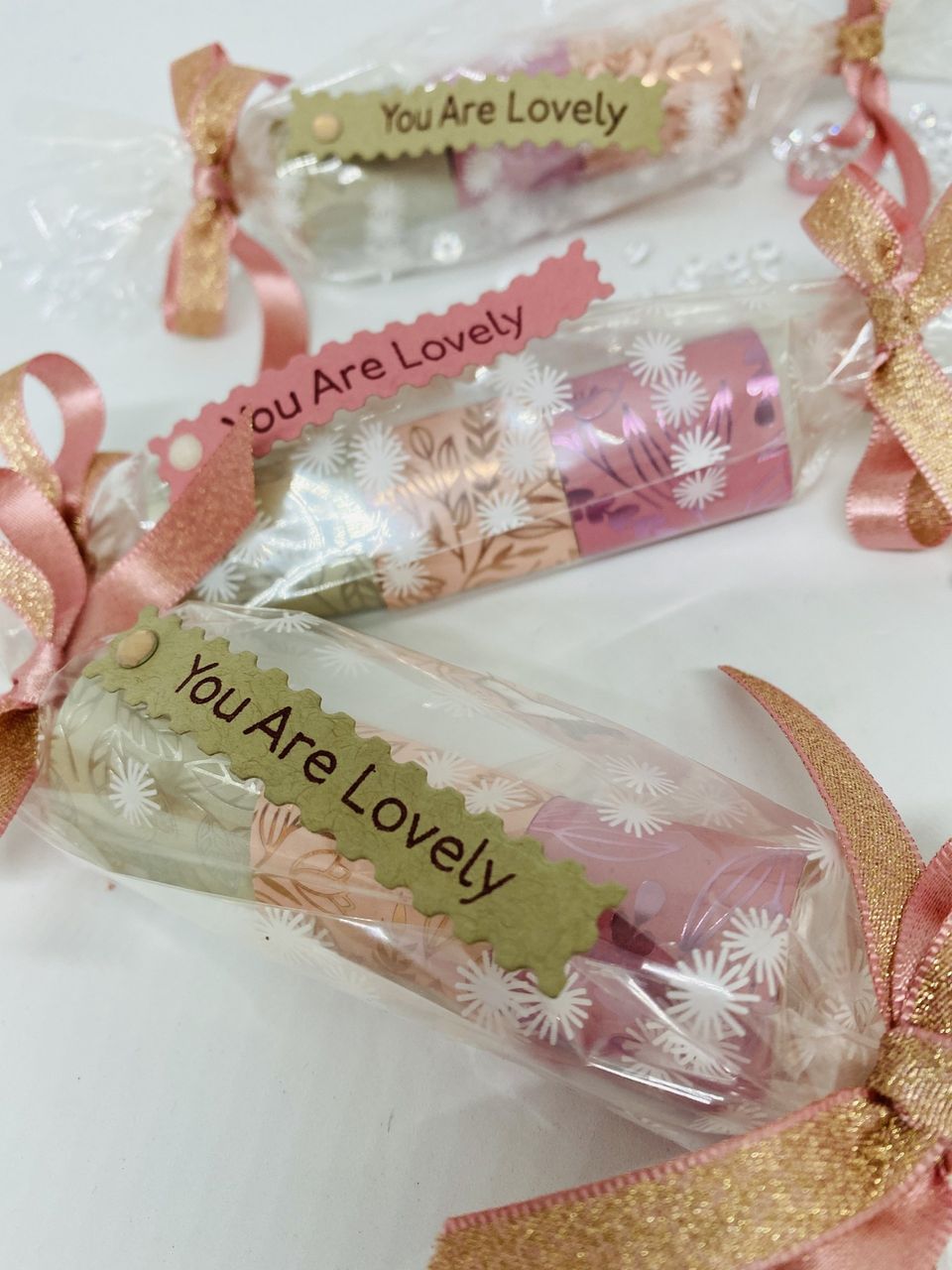 Das tolle Metallic-Designerpapier "Für immer im Herzen" eignet sich perfekt für Verpackungen, also habe ich 3 kleine Streifen im Maß 3 cm x 9 cm zugeschnitten und um die Schokolade gelegt.