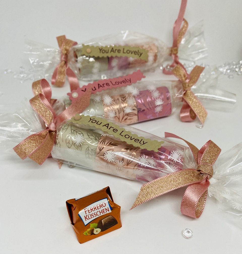 Ich hatte vor Kurzem eine 32er Packung Ferrero Küsschen geschenkt bekommen. Und da selten Schokolade auf meinem Basteltisch überlebt, musste ich mich wirklich schnell für eine gute Verpackungsidee entscheiden. Die tollen Zellophantüten kamen mir dann zu Hilfe.