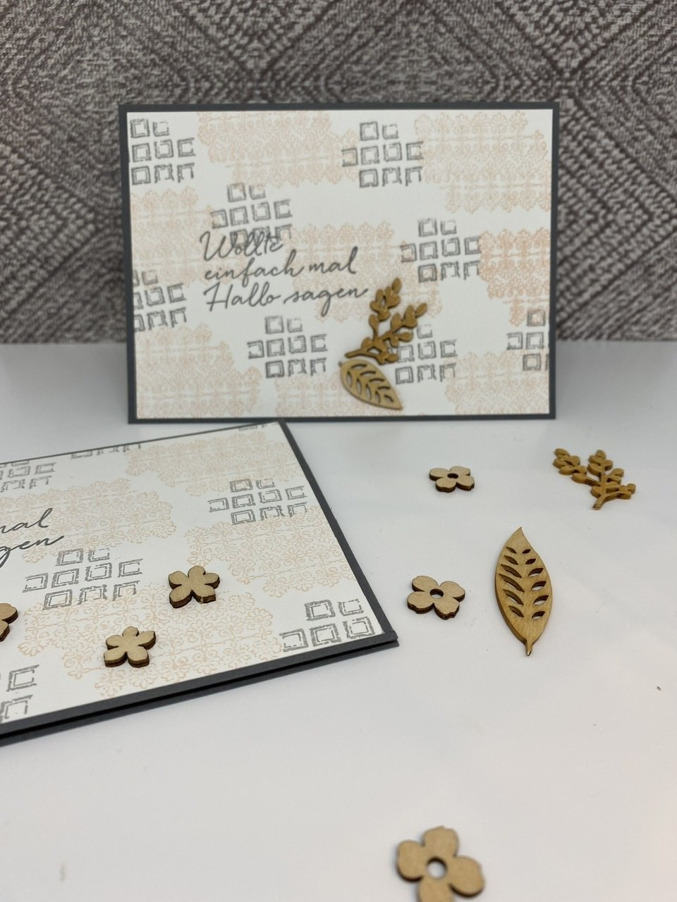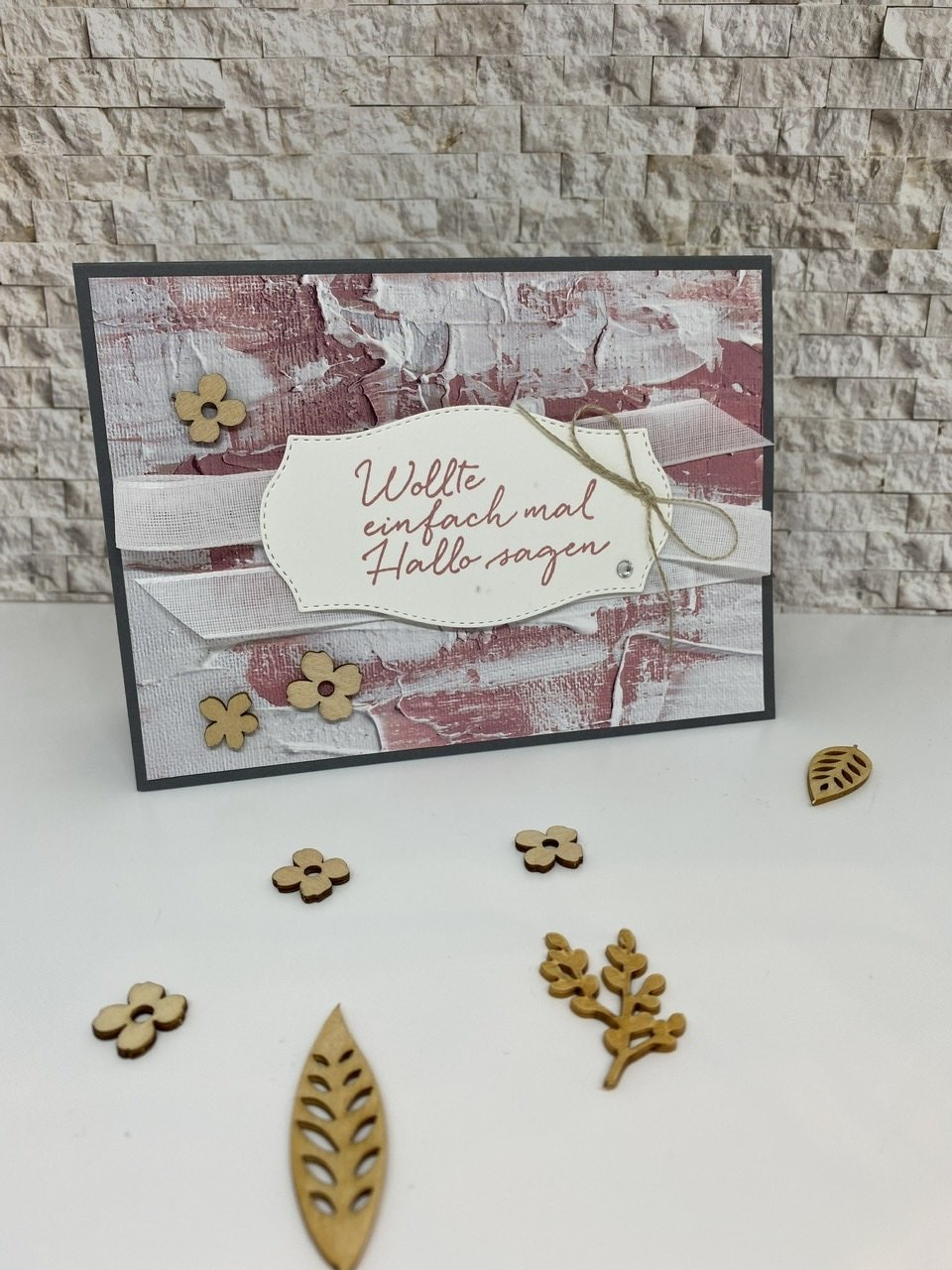 Die erste Karte ist eine ganz einfache, man benötigt kaum Material. Ich habe die Hintergrundstempel des o. g. Stempelsets in Anthrazit und Blütenrosa aufgestempelt im zweiten Abdruck und einen Spruch mit dem ersten Abdruck. Die Grundkarte in Anthrazit hat das Maß 21 m x 14,5 cm und der Aufleger in Vanille 10 cm x 14 cm. Die Blümchen - Holzaccessoires hatte ich noch aus früheren Beständen, aber in der Produktreihe Geschmackvoll gestaltet gibt es ja auch ganz wunderschöne Holzaccessoires.