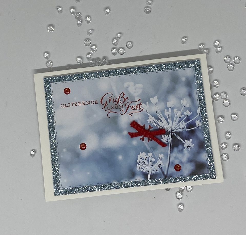 Ich habe flüsterweißen Farbkarton im Maß 14,5 cm x 21 cm verwendet, eine Mattung aus der tollen neuen blauen Glitzerfolie im Maß 13,5 x 9,5 und darauf den Aufleger aus Designerpapier, ausgestanzt mit einem bestickten Rechteck.