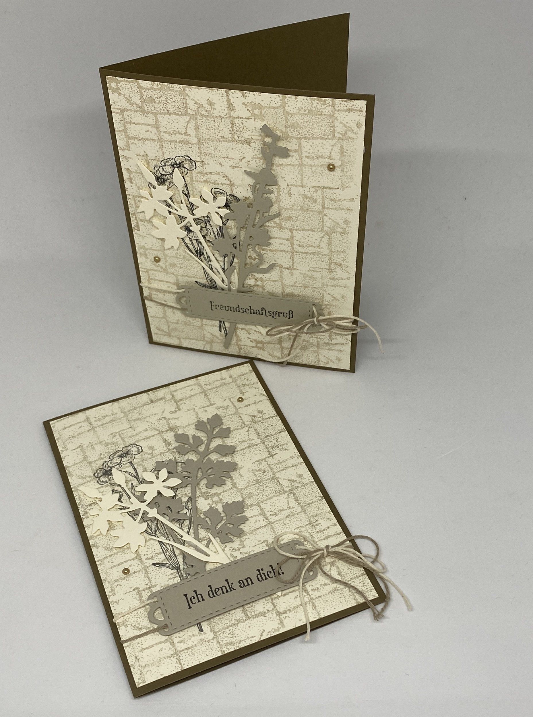 Weiterhin habe ich Wiesenblumen aus vanille- und saharasandfarbenem Farbkarton ausgestanzt und eine weitere Blume mit Memento-Schwarz aufgestempelt. Das Schildchen ist übrigens auch aus dem Wiesenblumen-Stanzpaket. Noch Kordel aus den Kordel-Basics im Set und ein paar goldene Metallic-Perlen. Fertig.